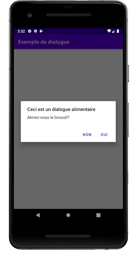 Cet exemple est celui d'un dialogue de base (classe AlertDialog), créé à l'aide d'un objet DialogBuilder. Le fichier de mise en page ne contient qu'un bouton permettant d'afficher ce dialogue.