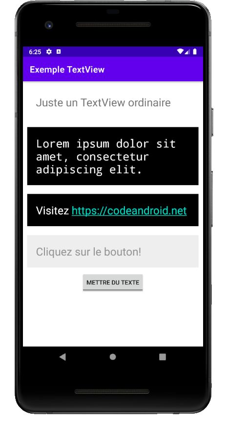 Tout comme le composant Button, le TextView n'est pas très spectaculaire, mais largement utilisé. L'exemple suivant démontre quelques-uns de ses attributs.