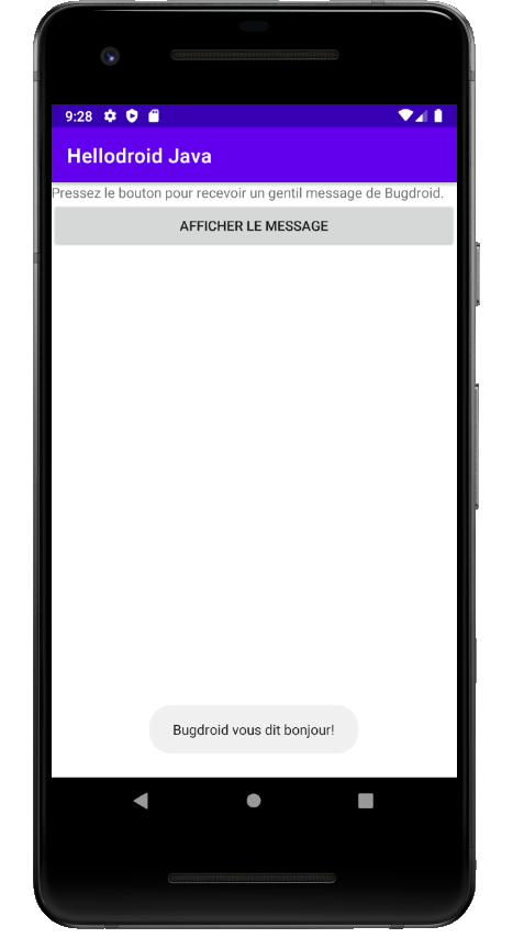 L'application "Hellodroid Java" affiche un message dans un toast lorsque l'on clique sur un bouton.